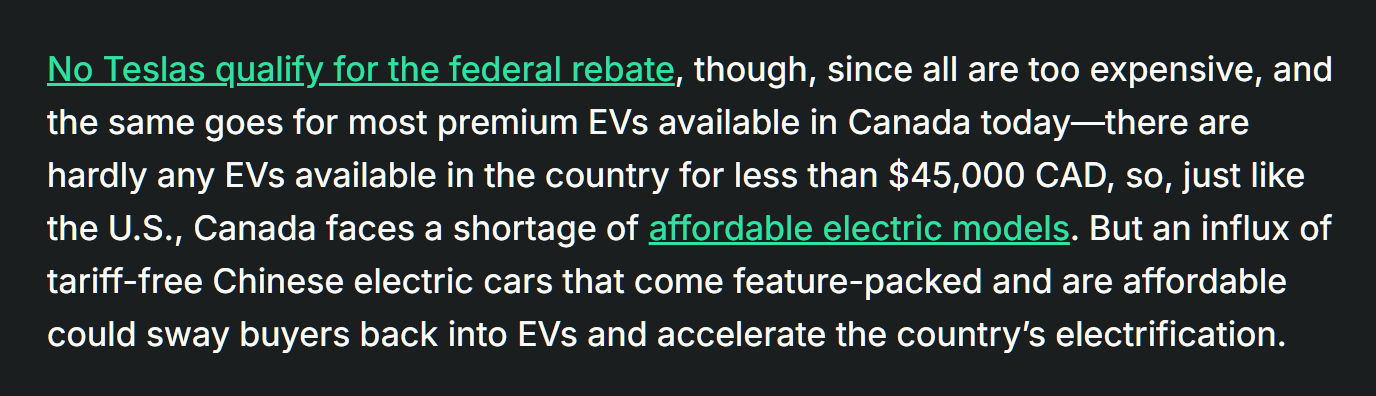 特斯拉价格过高,所有车型都无法享受加拿大联邦政府的补贴。目前加拿大市场几乎没有售价低于4.5万加元的电动汽车。和美国一样,加拿大也面临着物美价廉的电动汽车产品短缺问题。但是,如果配置丰富、价格实惠的中国电动汽车能够免税进入,将会重新吸引消费者购买电动汽车,并加速加拿大的电气化进程。”